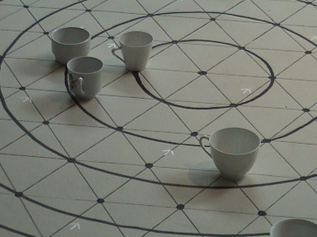 Der quadratisch gegliederte Fliesenboden der Großen Bergstraße soll mit einem bunten Teppich aus Arabesken geschmückt werden. Farbige Kreiden stehen bereit.