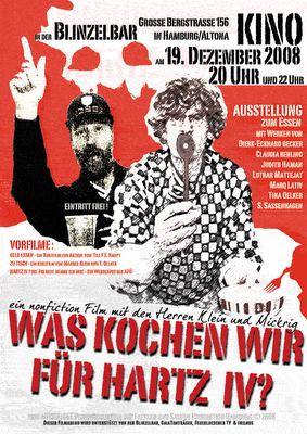 Der nonfiction Film "Was kochen wir für Hartz IV ?" wird erstmalig auf Leinwand gezeigt! Anwesend sein werden die Macher Herr Klein und Herr Mickrig, die Produzentin von Fressen & Saufen und die KünstlerInnen der Ausstellung.