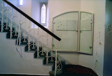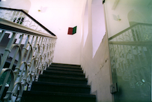 Das Winkelbild "rot und grün" im Treppenhaus verweist auf die Farben der Kirche; sie bedeuten im kirchlichen Kalenderjahr Leben und Dynamik.