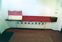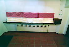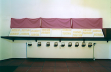 Der Schaukasten war von einem lachsroten Samttuch verdeckt, die Hostienbilder darunter nur im aufgedeckten Zustand sichtbar.