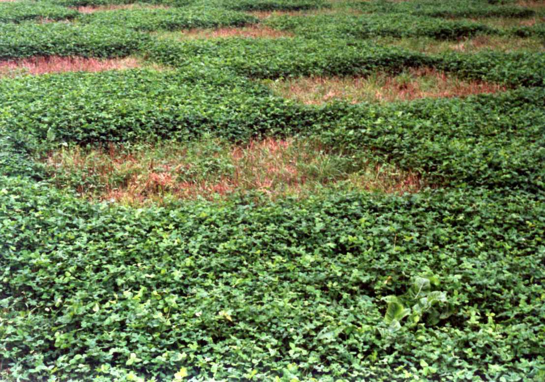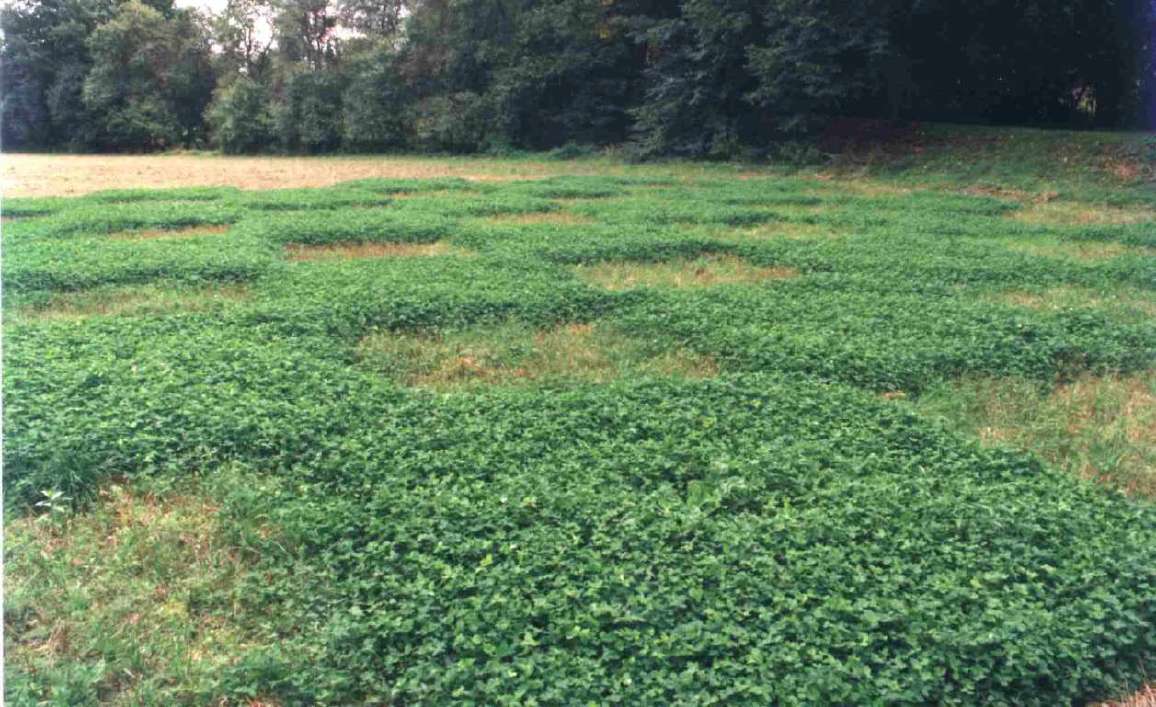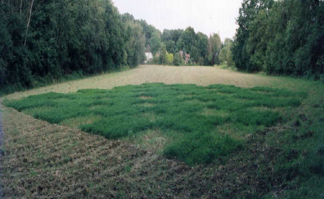 Aussaat am 29. März 2002 mit weißen Kleesamen auf das keimende Weizenfeld in 32 Felder à 3 x 3 m auf dem 1,3 ha. großen Acker von Martin Feller, Schweizerhof 1, 29549 Bad Bevensen.